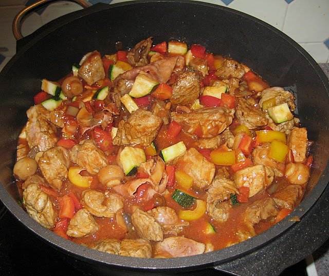 Alle Zutaten in große Stücke schneiden. Zwiebeln und Rindfleisch in einem großen Bräter ordentlich anbraten. Zwiebeln und Rindfleisch auf den Bräterdeckel geben und Fleisch von allen Seiten anbraten. Gemüse und Zwiebel/Rindfleisch zugeben. 175 ml Wasser, Zigeunersoße, Ketchup und Gewürze zugeben und in dem geschlossenen Bräter für 1,5 Stunden bei 200°auf der untersten Schiene in den Ofen.