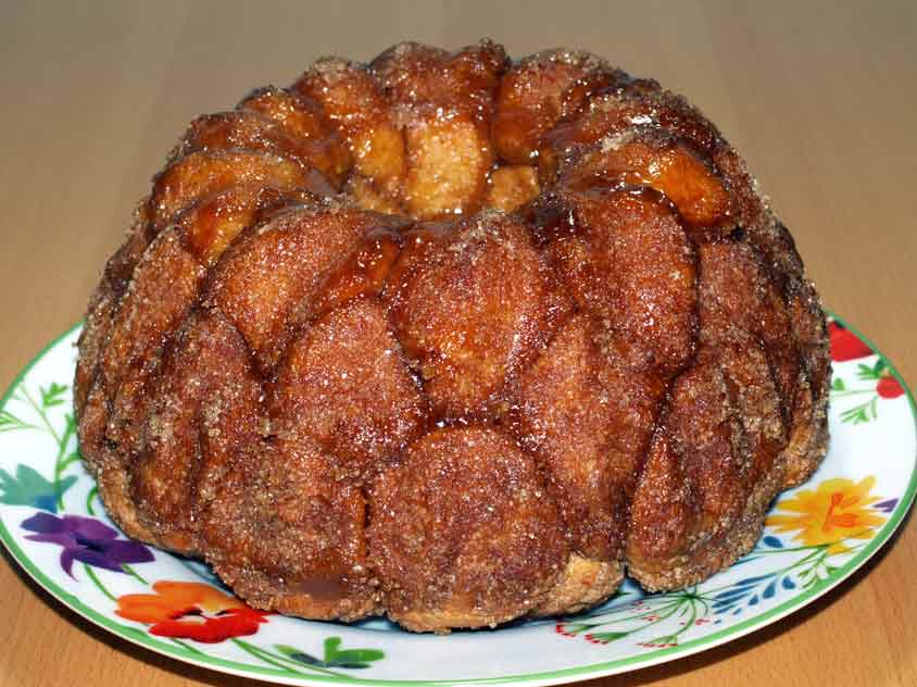 Das Affenbrot nach dem Backen 10 Minuten abkühlen lassen und dann aus der Backform stürzen. Das Affenbrot sollte nicht länger in der Form bleiben, damit der karamellisierte Zucker nicht an der Form festsitzt.