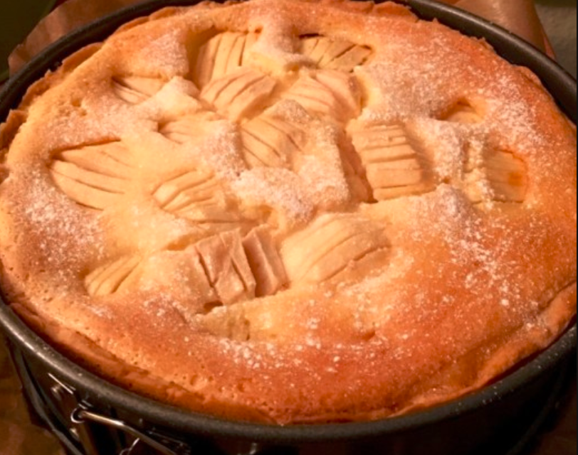 2/3 vom Mürbeteig auf dem Boden der Springform auslegen, den zur langen Rolle formen und als 3 cm breiten Rand anlegen. Die Äpfel abtropfen lassen, mit der geritzten Seite nach oben auf den Teig legen und vorsichtig den Guss drübergeben.