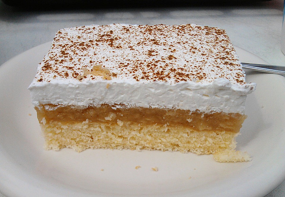 Aus Puddingpulver, Apfelsaft und Zucker einen Pudding zubereiten. Die geschälten Äpfel reiben und in den Pudding geben. Die Creme auf den Biskuit streichen und auskühlen lassen. Mit geschlagener Sahne verzieren und mit Zimt bestreuen.