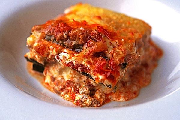 Zutaten : Zutaten für 4 Portionen 1 kg Zucchini, große, dicke 500 g Rinderhackfleisch 1 große Zwiebel(n) 1 Knoblauchzehe(n) 1 Dose Tomate(n), stückige 1 Pck. Frischkäse 100 ml Milch n. B. Sauerrahm 1 EL Tomatenmark 150 g Käse, gerieben Olivenöl Oregano Thymian Petersilie Salz und Pfeffer Paprika, edelsüß Zubereitung : Arbeitszeit ca. 40 Minuten Koch-/Backzeit …