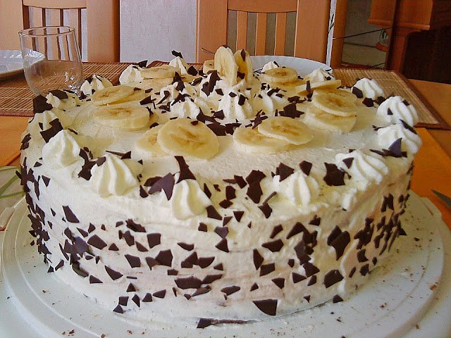 Einen der hellen Böden auf eine Tortenplatte legen und mit der Hälfte der Schokocreme bestreichen. Einen dunklen Boden darauf legen. Mit den Bananen belegen und die Vanillecreme darauf streichen. Wieder einen hellen Boden darauf legen. Die übrige Schokocreme darauf streichen und den letzten (dunklen) Boden aufsetzen.
