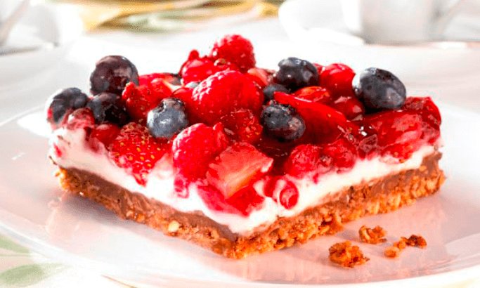 Anschließend den ganzen Pfanneninhalt noch gut warm auf den Kuchenboden gießen, die Beeren darauf gleichmäßig verteilen und anschließend abkühlen lassen.