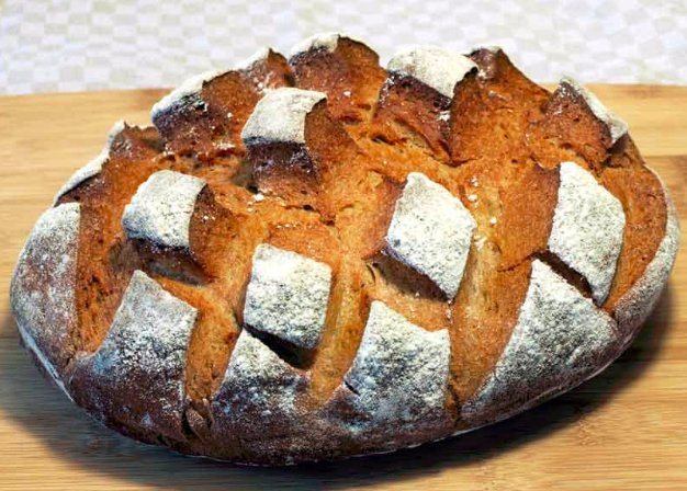 Danach das Krustenbrot mehrmals mit einem scharfen Messer kreuzweise etwa 2 Zentimeter tief einschneiden, die Auflaufform oder den Römertopf mit dem Deckel abdecken, und das Krustenbrot in den noch kalten Backofen stellen. Den Ofen auf 220 Grad Umluft einstellen und das Krustenbrot eine Stunde in der abgedeckten Form backen. Dann den Deckel entfernen, und das Krustenbrot bei 200 Grad solange weiter backen, bis das Weizenmischbrot eine schöne knusprige Krume hat.