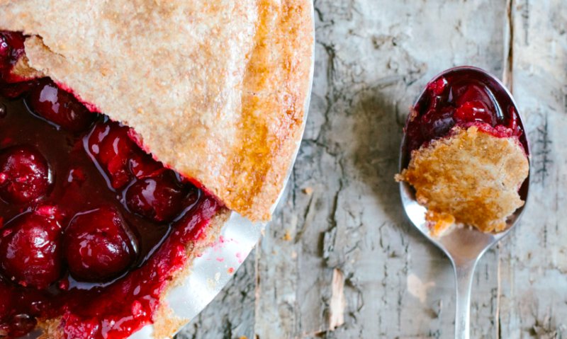 Den Ofen auf 175°C vorheizen. Den Mürbeteig zweiteilen, der etwas größere Teil wird der Boden, der etwas kleinere der Deckel. Das größere Stück zwischen Frischhaltefolie dünn (ca. 1/2cm) auf etwa 28 cm Durchmesser ausrollen. Am einfachsten könnt ihr den Teig in die Form bringen, in dem ihr ihn vorsichtig und locker auf das Nudelholz auf- und über der Pie-Form wieder abrollt. Drückt den Teig an den Rändern vorsichtig an und lasst dabei überstehenden Teig einfach stehen. Ihr könnt den Boden noch mit einer Gabel einstechen, danach wird das Kirschkompott eingefüllt. Danach das kleinere Teigstück auf ca. 25 cm Durchmesser ausrollen. Das andere Ei und die Milch werden in einem Schüsselchen verquirlt und auf den Rand des Tortenbodens gestrichen, damit Ober- und Unterteil gut verschlossen werden. Den Kuchen mit dem Deckel belegen und die Teigränder zusammendrücken. Der Überstand wird nun abgeschnitten und kann nach Lust und Laune zum Dekorieren der Pie benutzt werden. Zum Schluss wird der Kuchen mit der Ei-Mischung bestrichen und mit strahlenförmigen, kleinen Schnitten versehen, damit der Dampf entweichen kann und der Teig nicht aufplatzt. Auf unterster Schiene wird die Cherry Pie 35 Minuten gebacken.
