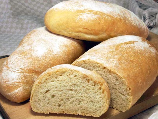 Mehl auf die Arbeitsfläche streuen und darauf den Ciabatta-Teig geben. Den Teig nun vorsichtig behandeln und nicht mehr kneten. Den Teig in drei gleich große Stücke teilen, und aus jedem Teigstück ein Ciabatta-Brot formen. Die Ciabatta-Brote mit ein wenig Mehl bestauben. EinBackblech mit Backpapier auslegen und darauf die Ciabatta-Brote etwa 2 Stunden bis zur gewünschten Größe gehen lassen. Dann das Ciabatta etwa 45 Minuten bei anfänglich 200 Grad Umluft oder 225 Grad Unter/Oberhitze backen. Nach 10 Minuten die Temperatur auf 180 Grad / 200 Grad senken.