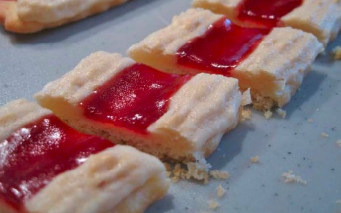 5- Kekse herausnehmen und die noch heißen Zwischenränder mit heißer Marmelade (kann man in der Mikrowelle aufwärmen) ausfüllen, abkühlen lassen und die Eisenbahner in 2 cm breite Streifen schneiden.