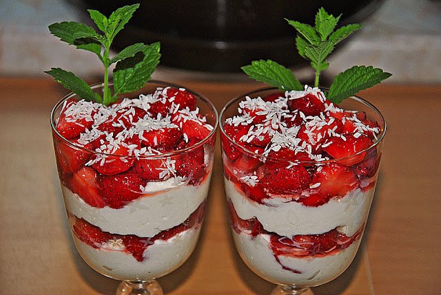 6 Dessertgläser bis zur Hälfte mit der Creme füllen, dann eine Schicht Erdbeeren darauf verteilen, zum Schluss wieder die Creme darauf geben. Mit etwas Kokosstreusel bestreuen und mit einer Erdbeere dekorieren.