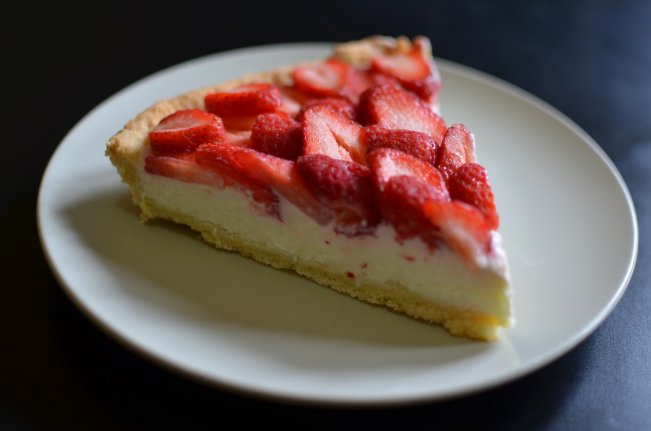 4.Den Kuchen mit Erdbeeren belegen und mit rotem Tortenguss überziehen. (Den Tortenguss nach Packungsanleitung zubereiten – jeder Guss ist anders, deshalb sollte man sich nach den Informationen vom Hersteller richten.)