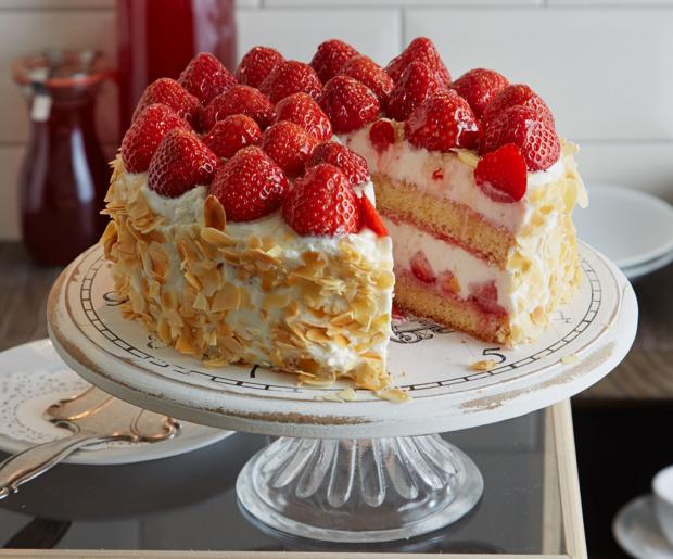 3. 600 g Sahne steif schlagen. Gut 1/3 der Sahne in einen Spritzbeutel mit großer Sterntülle füllen. Torte mit restlicher Sahne einstreichen und Sahnetuffs auf die Torte spritzen. Raffaello halbieren. Torte mit restlichen Erdbeeren und Raffaello verzieren. Bis zum Anrichten kalt stellen.