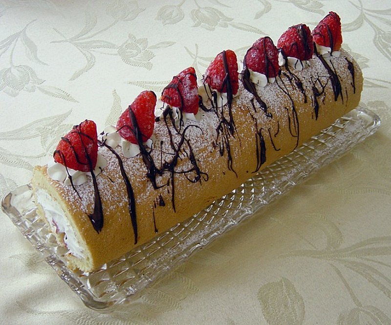 Die ausgekühlte Rolle wieder vorsichtig ausrollen und das Papier abziehen. Mit 300 g der Sahne bestreichen, die Erdbeerviertel darauf streuen. Aufrollen und mit Sahne bestreichen. Mit der restlichen Sahne und den beiseite gelegten Erdbeeren verzieren.