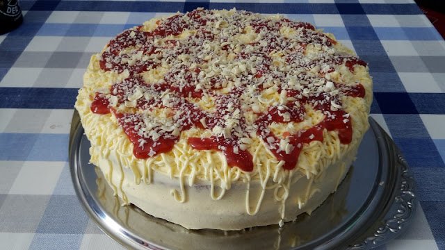 Die Erdbeermarmelade pürieren, auf die Torte geben und mit den weißen Schokoblättchen bestreuen.