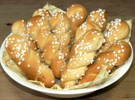 Den Teig nicht gehen lassen, sondern gleich zu Flachswickeln formen. Dazu den Hefeteig zu einer Rolle formen, und die Rolle in 18 gleich große Stücke schneiden. Aus den Teigstücken etwa 25 cm lange Rollen formen. Da der Hefeteig etwas zäh ist, geht das am besten etappenweise. Das heißt zuerst alle Teigstücke nur etwa 10 cm lang, und dann auf 25 cm rollen. Dann die Teigrollen mittig zusammen legen, und die Teig-Enden umeinander wickeln.