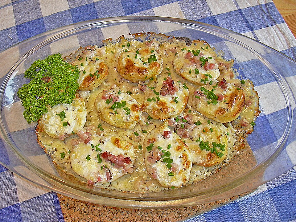 Kartoffeln säubern, der Länge nach gerade durchschneiden und mit der Schnittfläche nach unten auf ein Backblech legen. Mit Salz und Pfeffer bestreuen und dem Öl beträufeln, bei 200° in den vorgeheizten Backofen und 45 Min. backen. Den Käse reiben, mit der Sahne verrühren, die Kartoffeln umdrehen und mit der Mischung bestreichen, den in kl. Würfel geschnittenen Rindfleisch aufsetzen und weitere 10 Min. backen, dann mit dem Kümmel bestreuen. Dazu gibt es einen gemischten grünen Salat.
