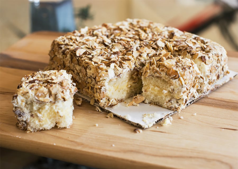 Butter und Zucker in der Pfanne erhitzen und die Mandelstifte hinzugeben und karamellisieren lassen. Die Mandeln in der Pfanne erkalten lassen und auf der Creme verteilen.
