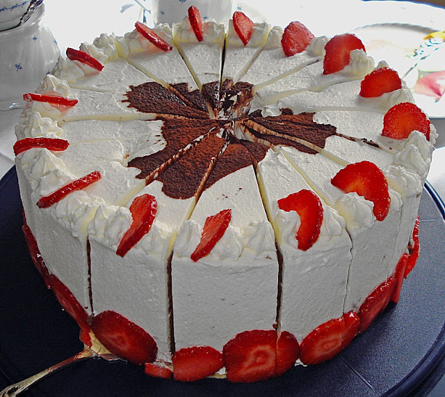Mit der übrigen Sahne und den restlichen Erdbeeren und Amarettini den Tortenrand und die Tortenmitte nach Belieben verzieren. Danach nochmals einige Stunden kalt stellen.