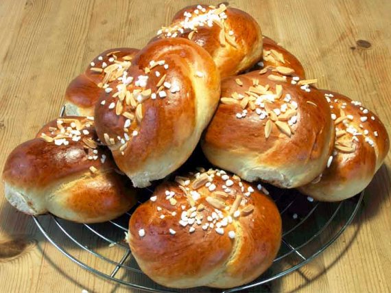 Die fertig gegangenen Hefeknoten nochmal mit der Eistreiche bestreichen und mit Mandelstiften und Hagelzucker bestreuen. Dann die Hefeknoten im vorgeheizten Backofen in etwa 20 Minuten hellbraun backen. Dabei nach 10 Minuten das Wassergefäß aus dem Ofen nehmen.