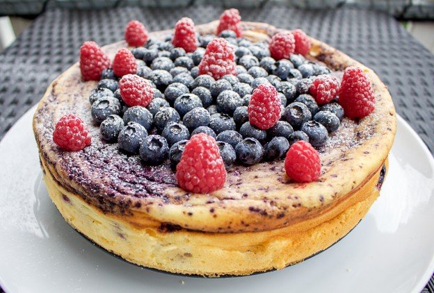 Den abgekühlten Kuchen könnt ihr später entweder so servieren, oder ihr macht es wie ich und belegt ihn noch mit Heidelbeeren und ein paar Himbeeren. Zusätzlich bestäubt ihr ihn noch mit Puderzucker und es ist angerichtet 😀