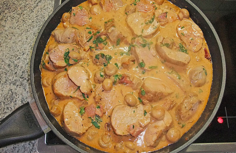 Schweinelende parieren, Medaillons schneiden und mit Salz und Pfeffer würzen. Zwiebel fein hacken, Pilze putzen und in Scheiben schneiden.