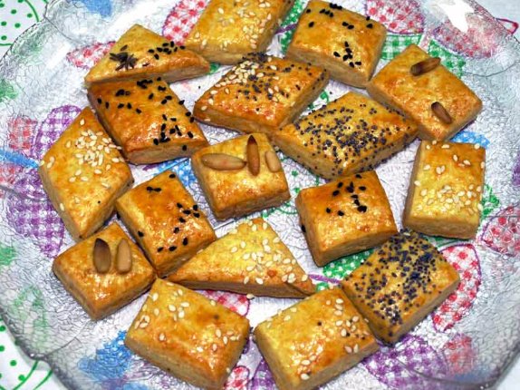 Für das Käsegebäck zuerst den Hartkäse möglichst fein reiben. In einer Schüssel den geriebenen Käse, Mehl, Backpulver, Salz und Paprikapulver gut vermischen und dann auf die Arbeitsfläche geben. Die in Würfel geschnittene kalte Butter, das Ei und das Eiweiß dazu geben (ein Eigelb wird zum Bestreichen verwendet). Den Mürbeteig von Hand geschwind zusammen kneten. Mürbeteig darf nicht zu lange geknetet werden weil er sonst rissig wird. Den Mürbeteig eine halbe Stunde in den Kühlschrank legen.