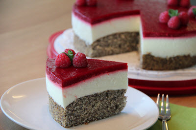 Eine runde Schüssel (Durchmesser 24 cm) mit Frischhaltefolie auslegen. Die Sahnemasse hineingeben, glatt streichen und den ganzen Boden drauf legen. 30 Minuten in den Kühlschrank stellen.
