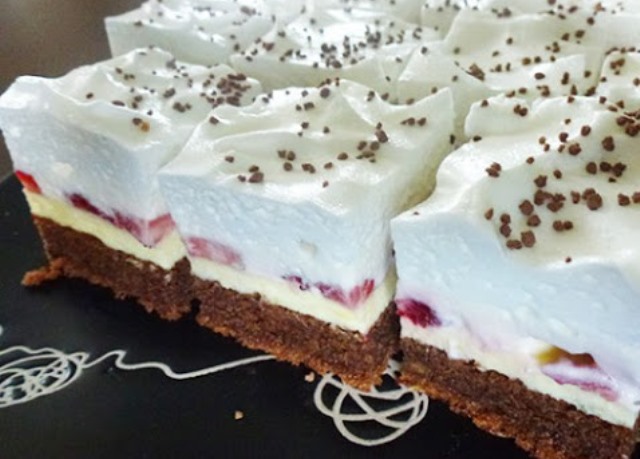 5. Biskuitboden auskühlen lassen und aus der Form lösen. Boden zwei Mal waagerecht teilen.