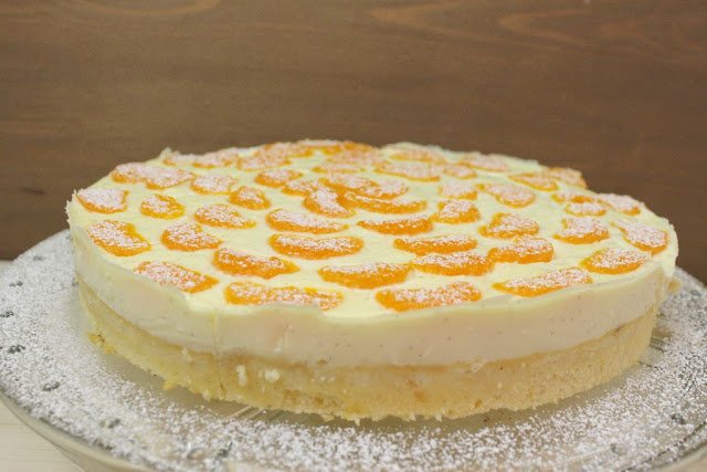 3. Backt den Kuchen bei 175°C Ober- und Unterhitze für 20-25 Minuten im vorgeheizten Backofen. Währenddessen lassen wir die Mandarinen aus der Dose abtropfen, fangen den Saft auf und bereiten die Schmandcreme vor.
