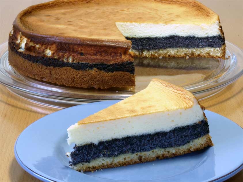 Derweil den Mohnschecken-Guss zubereiten. Eiweiß und Eigelb der drei Eier trennen. Die Eiweiße mit dem Puderzucker und Zitronensaft zu Eischnee schlagen. Durch den Zitronensaft wird der Eischnee schön fest. Mit dem Hand-Rührgerät in einer separaten Schüssel die drei Eigelbe mit dem Vanillepudding-Pulver oder der Speisestärke glatt verrühren. Dann zuerst den Schmand, und dann den Eischnee darunter rühren. Den Mohnschecken-Guss auf der vorgebackenen Mohnschecke verteilen, und die Mohnschecke in etwa 15 Minuten fertig backen. Die Mohnschecke erst aus der Form nehmen wenn sie vollständig abgekühlt ist.