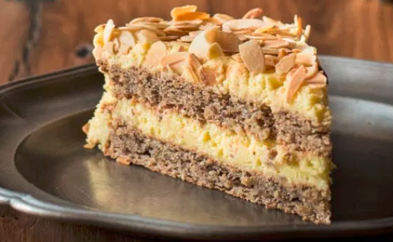 Für den Biskuit Eier, Zucker und 4 Esslöffel Wasser mindesten 8 Minuten weißschaumig rühren. Mehl, Nüsse, Salz und Backpulver mischen und unterheben. Die Masse in eine mit Backpapier ausgelegte Springform füllen und im heißen Backofen 30 bis 35 Minuten backen. Abkühlen lassen.