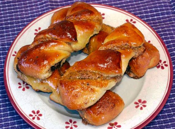 Das zurück behaltene Eigelb mit 2 Esslöffel Milch und einer Prise Salz verrühren. Den oberen Teil der Streifen nach unten über die Füllung klappen, ein wenig über die Teigstreifen-Mitte hinaus, und dann den Teigrand mit ein wenig von der Eigelb-Milch-Mischung einstreichen (dient als Kleber). Nun den unteren Teil nach oben klappen, die Teigränder ein wenig zusammendrücken, und die beiden Teigstreifen jeweils in 12 gleich breite Teigstücke schneiden.