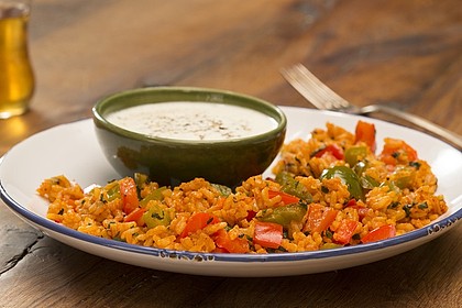 Joghurt und gepressten Knoblauch verrühren, mit Salz und Pfeffer abschmecken. Den Reis mit einem Klecks von der Joghurtsauce servieren.