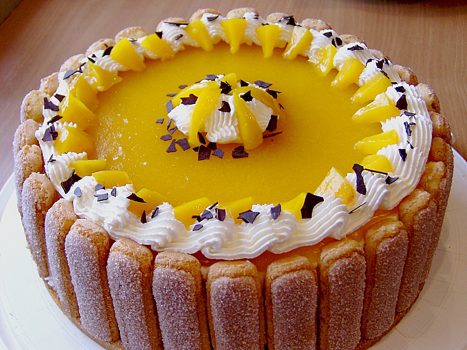 Einen Tortenring um den Biskuit legen. Die Löffelbiskuits an einer Seite gerade schneiden, sodass sie ca. 7 cm lang sind. Die Enden zerbröseln. Die Löffelbiskuits dicht an dicht mit der Rundung nach oben innen an den Tortenring stellen. Den Biskuitboden mit den Pfirsichspalten belegen.