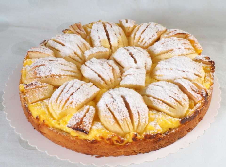 Puddingcreme mit Milch nach Packungsanweisung zubereiten. Creme auf den vorgebackenen Boden streichen. Mit Äpfeln belegen. Mit 30 g Zucker bestreuen und 20 g Butterflöckchen auf die Äpfel setzen. Weitere 40 Minuten backen.