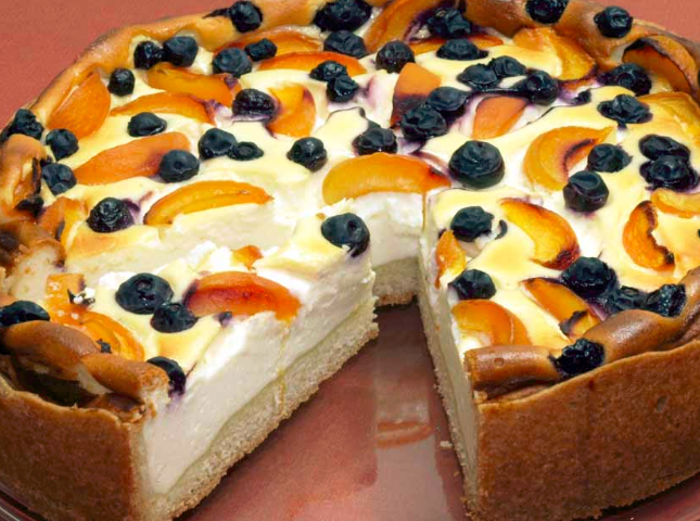 Quarkkuchen Eine 26 cm-Springform mit Butter fetten. Den gekühlten Mürbeteig nochmal kurz durchkneten und die Springform mit dem Mürbeteig auslegen. Dabei einen etwa 4 cm hohen Teigrand formen. Die Quarkkuchen-Füllung in die Form geben. Den Quarkkuchen zuerst 15 Minuten vorbacken, damit die Quarkkuchen-Oberfläche ein wenig fest wird und der Quarkkuchen-Belag nicht im Quarkkuchen versinkt. Dann die Aprikosen und Heidelbeeren oder Brombeeren vorsichtig auf dem Quarkkuchen verteilen, und den Quarkkuchen in weiteren ca. 45 Minuten fertig backen.