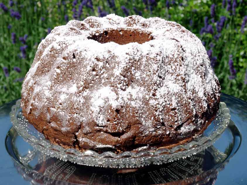 Nach dem Backen den Rotweinkuchen leicht abkühlen lassen und dann aus der Form auf ein Kuchengitter stürzen. Zuletzt den Puderzucker in ein Küchensieb geben und den Rotweinkuchen damit einstauben.