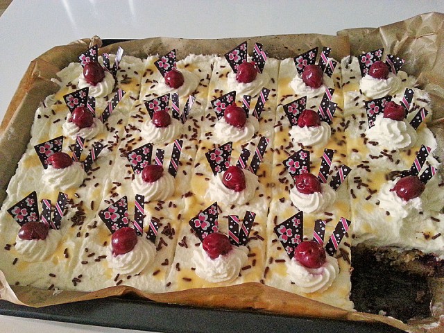 Backofen auf 180° C (Gas: Stufe 2, Umluft: 160° C) vorheizen. 1/2 Teelöffel Zitronenschale abreiben. Margarine mit Eiern, Zucker, Schmand und Zitronenschale schaumig schlagen. Mehl mit Backpulver mischen und nach und nach unterrühren.