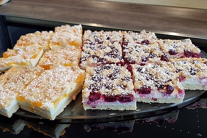 - Die Zutaten für den Belag, außer dem Obst, gut verrühren und auf den Teig streichen. Den Belag mit dem Obst nach Wahl belegen und den Rest des Teiges wie Streusel darauf verteilen.