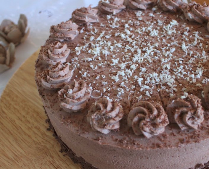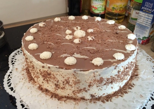 Torte aus der Kühlung holen und vom Tortenring lösen. Tortendeckel unbd Außenränder einstreichen (etwas Creme für die Dekoration zur Seite legen) und glatt abziehen. Restliche Creme in einen Spritzbeutel mit Sterntülle geben, Dekoration aufspritzen. Nach Wunsch dekorieren – ich habe dunkle und weiße Schokolade darüber gestreut und den unteren Rand mit Schokoraspel bestreut.