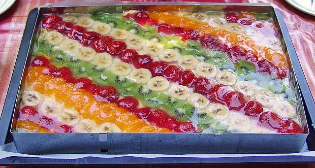 Den Kuchen 2 x waagrecht teilen damit 3 Tortenböden entstehen. Den Tortenboden auf eine Tortenplatte legen, mit einem Tortenring umschließen. Den Tortenboden mit der Tränke beträufeln, mit der Hälfte der Crem bestreichen und mit dem 2. Tortenboden abdecken. Wieder tränken und mit der restlichen Creme bestreichen. Mit dem 3. Tortenboden abdecken und im Kühlschrank kühlen – am besten über Nacht.