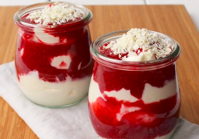Wir legen den Biskuitkuchen und den gemischten Hüttenkäse auf die Tassen und krönen das Ganze – natürlich können einige Stücke Sauerkirsche gehen.