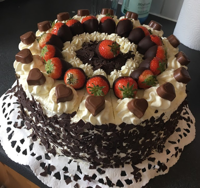 Den ausgekühlten Biskuit zweimal durchschneiden. Die Böden mit Likör beträufeln. Den Springformrand um den untersten Boden legen, das Erdbeerkompott darauf verteilen. Ein Viertel der Sahne darauf streichen. Mit dem zweiten Boden bedecken und diesen mit erwärmter Marmelade bestreichen. Ein weiteres Viertel der Sahne darauf verteilen, mit dem letzten Boden bedecken und leicht andrücken.