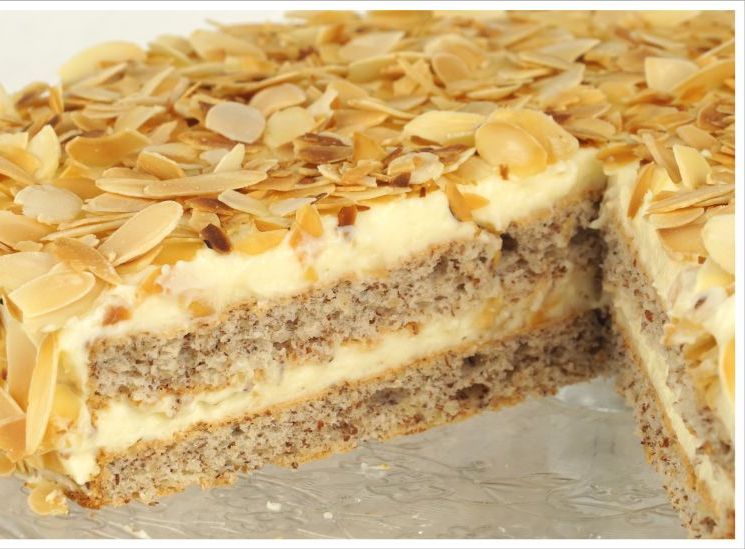 - 2. 4 Eiweiß steif schlagen, 100 g Zucker dabei einrieseln lassen. 100 g gemahlene Mandeln unterheben. Boden einer Springform (26 cm Ø) mit Backpapier auslegen. Masse einfüllen und glatt streichen. Im vorgeheizten Backofen (E-Herd: 200 °C/ Umluft: 175 °C/ Gas: Stufe 3) 18–20 Minuten backen. Boden mit einem Messer vom Springformrand lösen, aus der Form nehmen und auskühlen lassen. Zweiten Boden ebenso zubereiten und backen. Mandelblättchen in einer Pfanne ohne Fett goldgelb rösten, herausnehmen und auskühlen lassen