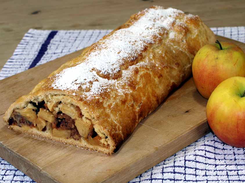 Apfelstrudel aus Südtirol mit Mürbeteig und Pinienkernen