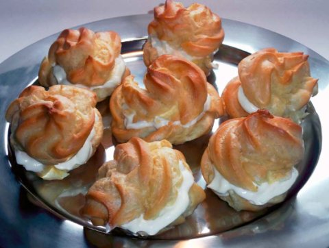 Auf den Tellern mit Schlagsahne und Obst servieren.