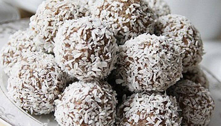 - Aus je einem gehäuften Tl kleine Kugeln formen. Dazu muss man ein bisschen pressen! Fertige Kugeln kühl stellen, während der Rest des Teiges geformt wird.