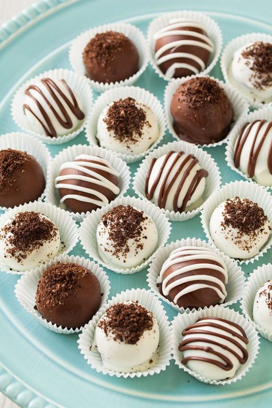 Oreos in den Mixer geben und sehr fein mixen. Etwas von der Oreomasse bei Seite legen, da sie später noch gebraucht wird. Dann den größeren Rest mit dem Frischkäse vermengen. Die Kuvertüre schmelzen lassen und aus der Oreo-Frischkäsemasse kleine Kügelchen formen, diese anschließend auf Zahnstocher aufspießen und für 20 Minuten ins Gefrierfach geben. Jetzt müssen die Kügelchen nur noch in die flüssige weiße Schokolade getunkt werden und auf Backpapier getrocknet werden. Solange die Schokolade noch warm ist, etwas von den Oreobröseln über die Pralinen geben. Wenn die Schokolade abgekühlt ist, könnt ihr die Zahnstocher entfernen und das Loch mit den Bröseln verschließen.