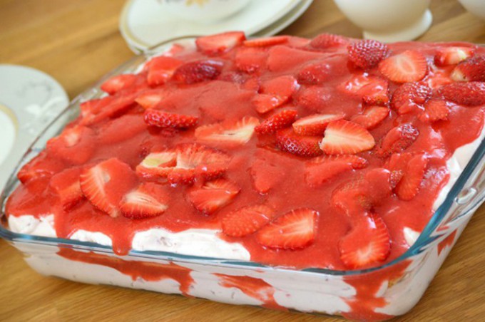 Sahne mit Vanillezucker und Sahnesteif fest schlagen und auf den Boden geben.